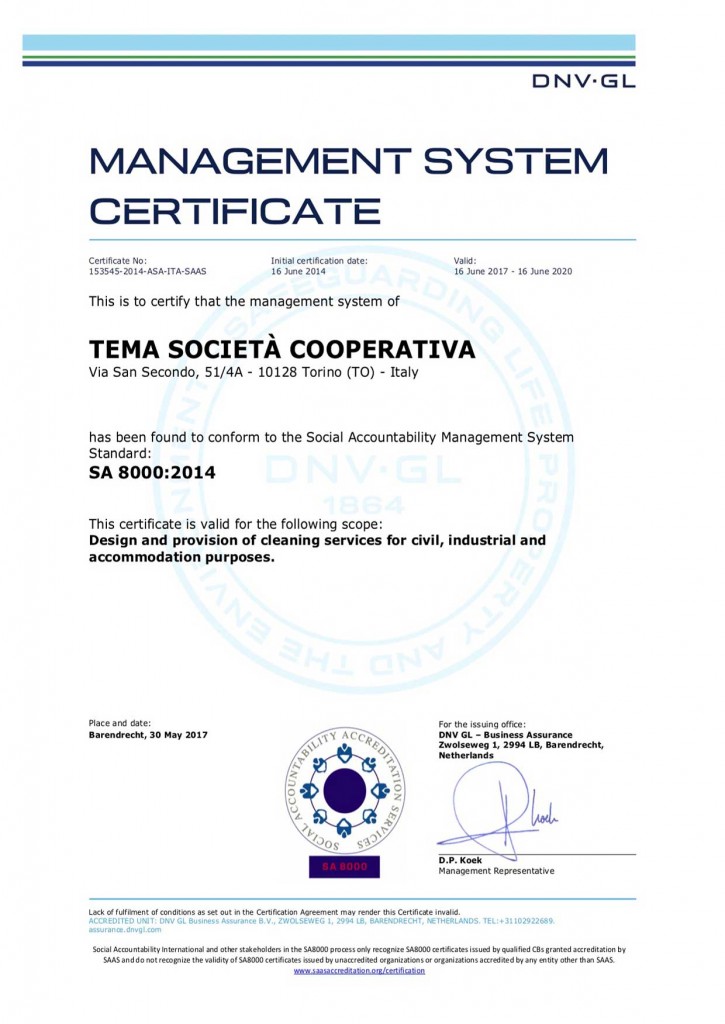 SOCIAL RESPONSIBILITY DEFENCE MANAGEMENT SYSTEM SA8000:2014 – certificate no. SA 153545-2014-ASA-ITA-SAAS dated 16/06/2014